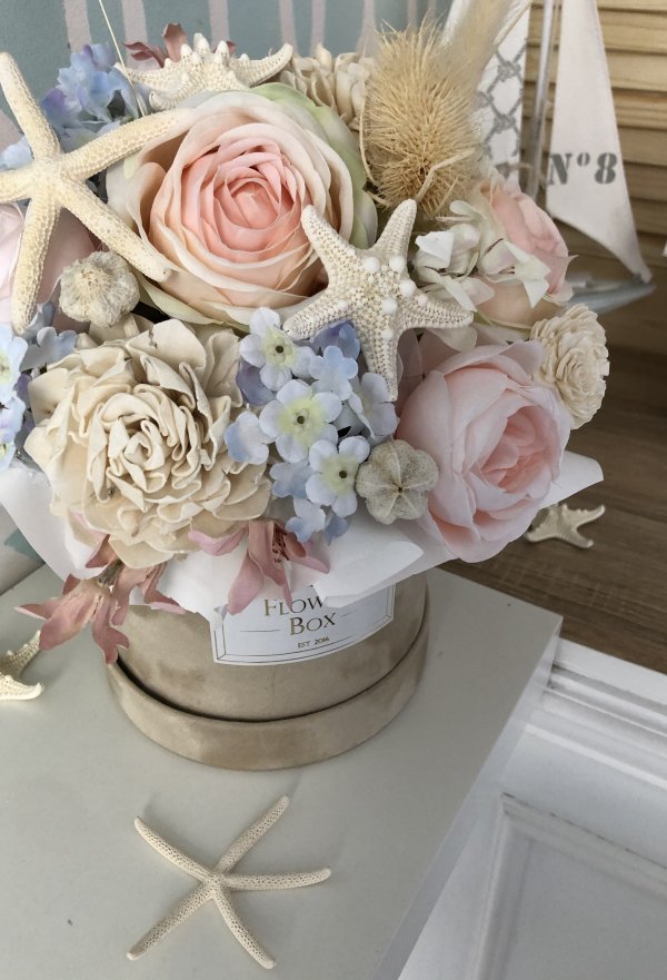 Ten niezwykły box prezentuje się przepięknie, jego połączenie kolorów oraz ozdobne muszelki sprawiają ze dodaje on lekkości oraz elegancji w każdym wnętrzu.