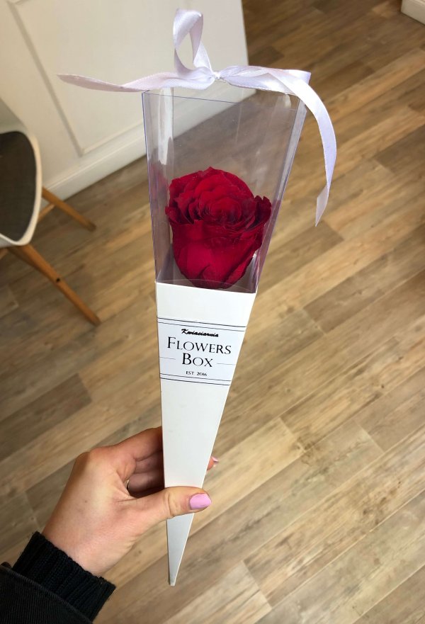Wieczna róża która znajduje się w kompozycji, to żywy kwiat który jest poddany procesowi wyparcia wody i dzięki specjalnemu procesowi zachowuje swój piękny wygląd przez 2 lata.